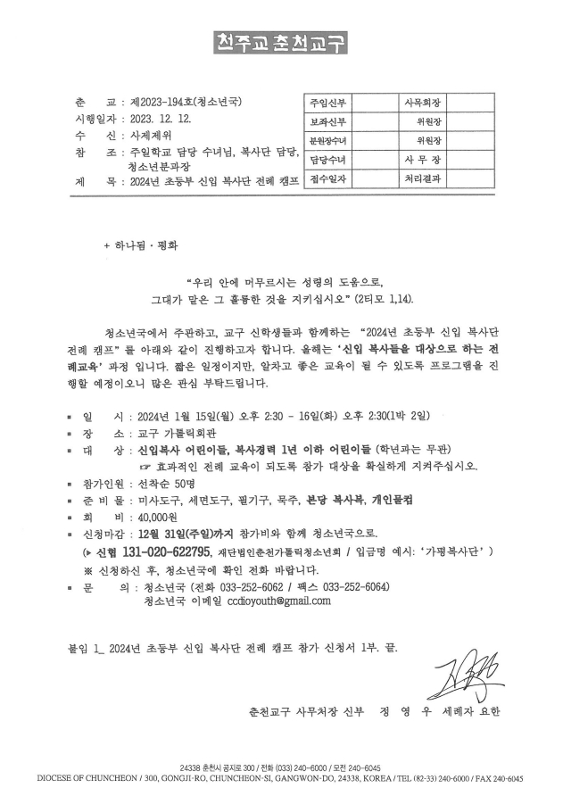 첨부 춘교 23-194호 2024년 초등부 신입 복사단 전례 캠프.pdf , 춘교 23-194호 붙임 1_ 2024년 초등부 신입 복사단 전례 캠프 참가 신청서.hwp