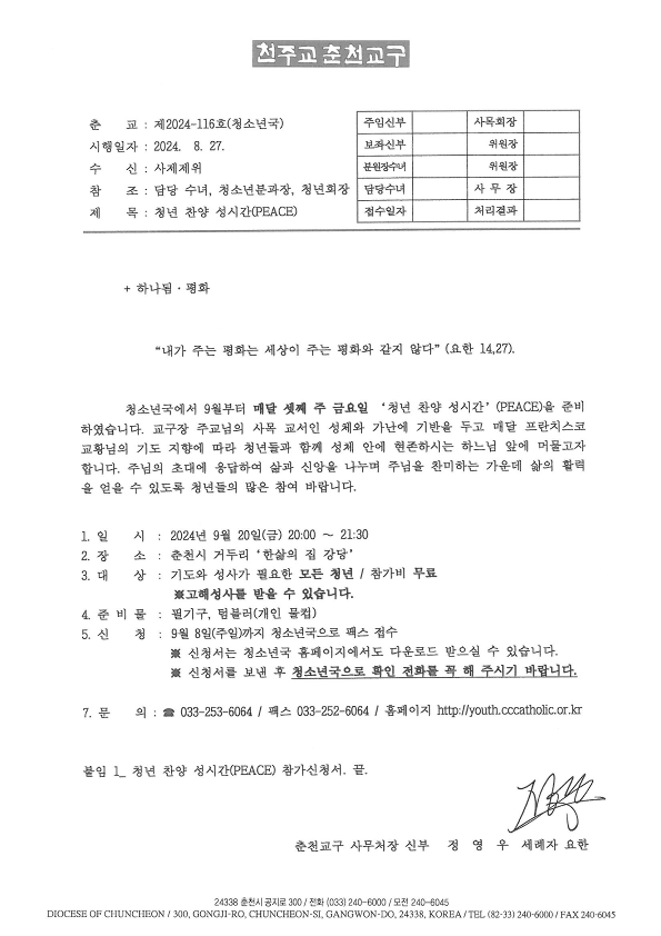 첨부 춘교 24-116호 청년 찬양 성시간(PEACE).pdf , 춘교 24-116호 붙임 1_ 청년 찬양 성시간(PEACE) 참가신청서.hwp